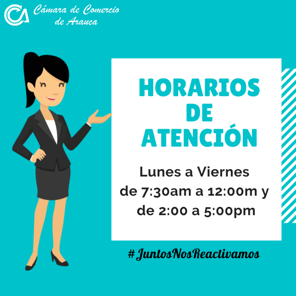 Con el propósito de continuar más cerca del empresario y garantizar la prestación de todos los servicios con calidad y eficiencia durante la emergencia ocasionada por el COVID-19; la Cámara de Comercio de Arauca, continuará prestando los servicios por oficina, guardando los protocolos de bioseguridad, de lunes a viernes, en el horario comprendido entre las 7:30 am a 12:00 meridiano y de 2:00 a 5:00 pm.