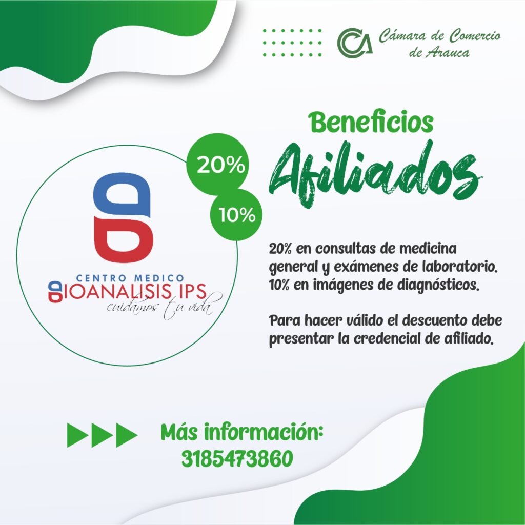 Recibe 1️⃣0️⃣ y hasta el 2⃣0⃣% de descuento en consultas de medicina general, exámenes de laboratorio e imágenes de diagnóstico en el Centro Medico Bioanalisis IPS.